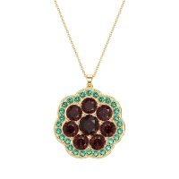This Ruby and Emerald Necklace is casted in 18k Yellow Gold. This Women’s Fashion necklace features exceptionally fine gemstones, on par with those found in the world's most exclusive boutiques and among the top 10% available globally. This Flower Pendant Showcases A Cluster Of Stones Meticulously Arranged To Form A Delicate Flower At Its Center. This Floral Core Is Then Embraced By An Outer Halo Also Crafted in A Graceful Flower Shape. This necklace comes with a complimentary 18-inch chain. Enjoy the confidence of our 30-day, stress-free return policy—with return shipping fully covered. Each piece is also accompanied by a Lifetime Warranty, ensuring lasting beauty and peace of mind.