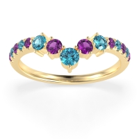 This Amethyst wedding ring is casted in 14k Yellow Gold and set with fine quality Amethyst and Swiss Blue Topaz. All of the gemstones we use are of the top 10% available, those found in fine quality boutiques across the world. This Amethyst wedding band can also be added to your collection of minimalist Amethyst rings. This Chevron Ring Showcases A Graceful Cascade Of Graduated Gemstones Down The Shank. Free shipping, returns, resizing, and a lifetime warranty ensure you love your purchase.