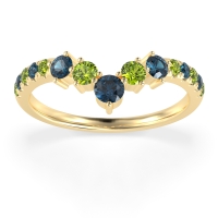 This Peridot wedding ring is casted in 18k Yellow Gold and set with fine quality Peridot and London Blue Topaz. All of the gemstones we use are of the top 10% available, those found in fine quality boutiques across the world. This Peridot wedding band can also be added to your collection of minimalist Peridot rings. This Chevron Ring Showcases A Graceful Cascade Of Graduated Gemstones Down The Shank. Free shipping, returns, resizing, and a lifetime warranty ensure you love your purchase.