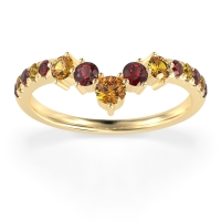 This Ruby wedding ring is casted in 14k Yellow Gold and set with fine quality Ruby and Citrine. All of the gemstones we use are of the top 10% available, those found in fine quality boutiques across the world. This Ruby wedding band can also be added to your collection of minimalist Ruby rings. This Chevron Ring Showcases A Graceful Cascade Of Graduated Gemstones Down The Shank. Free shipping, returns, resizing, and a lifetime warranty ensure you love your purchase.