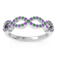 This Emerald wedding ring is casted in 18k White Gold and set with fine quality Emerald and Amethyst. All of the gemstones we use are of the top 10% available, those found in fine quality boutiques across the world. This Emerald wedding band can also be added to your collection of minimalist Emerald rings. This Band Features Two Undulating Rows Of Small Round Brilliants Gems Set in A Half Eternity Ring Around The Shank. Free shipping, returns, resizing, and a lifetime warranty ensure you love your purchase.