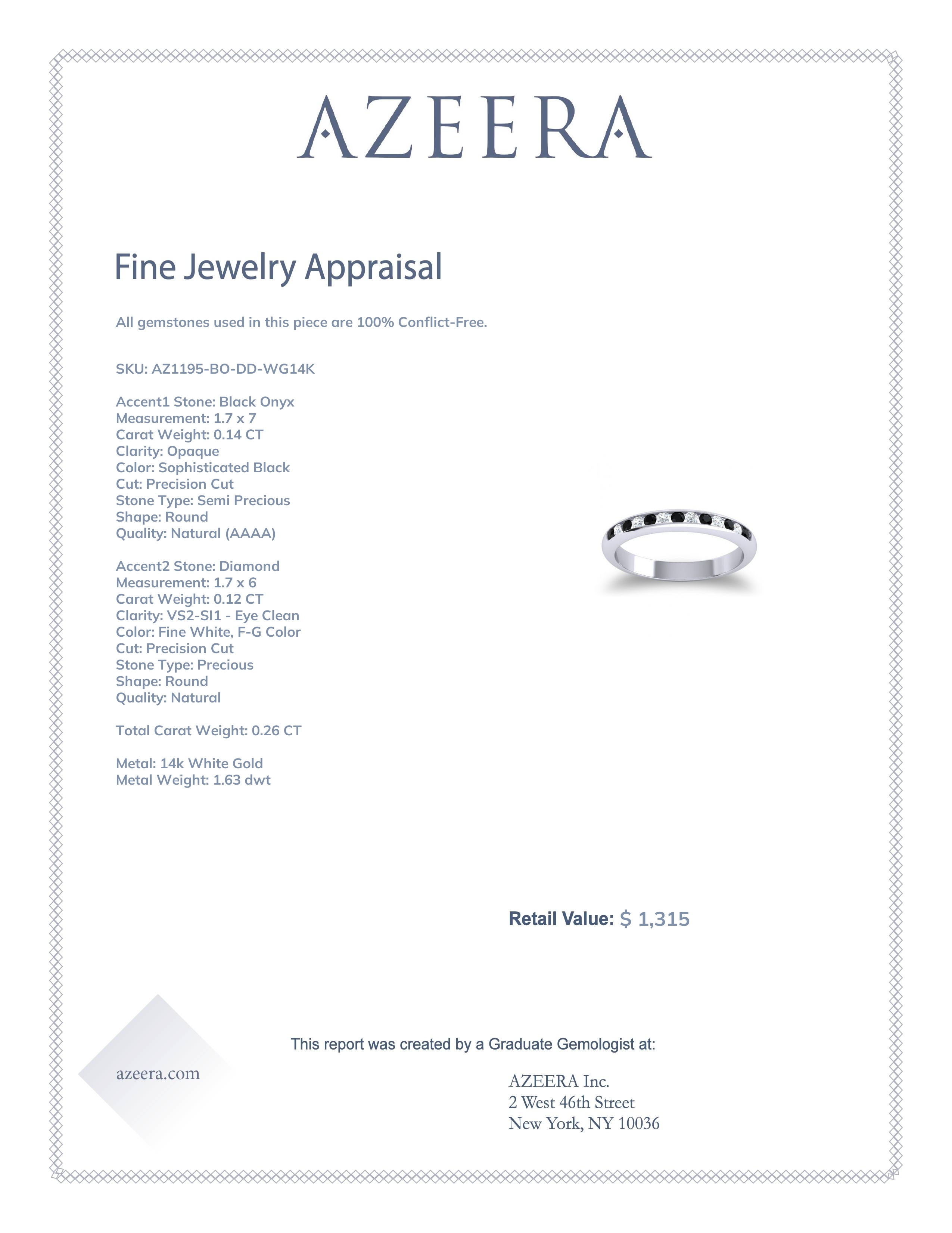 This Black Onyx wedding ring is casted in 14k White Gold and set with fine quality Black Onyx and Diamond. All of the gemstones we use are of the top 10% available, those found in fine quality boutiques across the world. This Black Onyx wedding band can also be added to your collection of minimalist Black Onyx rings. This Sleek Design Is The Perfect Alternative To Prong Set Bands. A Row Of Gems Is Secure Placed Between The Channel Setting And Is Complimented By The Rounded Band. Free shipping, returns, resizing, and a lifetime warranty ensure you love your purchase.