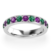 This Emerald wedding ring is casted in Palladium and set with fine quality Emerald and Amethyst. All of the gemstones we use are of the top 10% available, those found in fine quality boutiques across the world. This Emerald wedding band can also be added to your collection of minimalist Emerald rings. This Classic Wedding Band Consists Of A Channel Set Appearance, with The Traditional Prong Set Stones, Giving Added Security To The Gemstones. Free shipping, returns, resizing, and a lifetime warranty ensure you love your purchase.