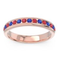 This Ruby wedding ring is casted in 18K Rose Gold and set with fine quality Ruby and Blue Sapphire. All of the gemstones we use are of the top 10% available, those found in fine quality boutiques across the world. This Ruby wedding band can also be added to your collection of minimalist Ruby rings. This Ring Features Round Brilliant Gems Channel Set in A Rounded Band Half Way Around The Shank. Free shipping, returns, resizing, and a lifetime warranty ensure you love your purchase.