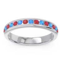 This Ruby wedding ring is casted in 14k White Gold and set with fine quality Ruby and Swiss Blue Topaz. All of the gemstones we use are of the top 10% available, those found in fine quality boutiques across the world. This Ruby wedding band can also be added to your collection of minimalist Ruby rings. This Ring Features Round Brilliant Gems Channel Set in A Rounded Band Half Way Around The Shank. Free shipping, returns, resizing, and a lifetime warranty ensure you love your purchase.