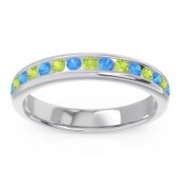 This Swiss Blue Topaz wedding ring is casted in 14k White Gold and set with fine quality Swiss Blue Topaz and Peridot. All of the gemstones we use are of the top 10% available, those found in fine quality boutiques across the world. This Swiss Blue Topaz wedding band can also be added to your collection of minimalist Swiss Blue Topaz rings. This Ring Features Round Brilliant Gems Channel Set in A Rounded Band Half Way Around The Shank. Free shipping, returns, resizing, and a lifetime warranty ensure you love your purchase.