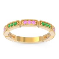 This Pink Tourmaline wedding ring is casted in 14k Yellow Gold and set with fine quality Pink Tourmaline and Emerald. All of the gemstones we use are of the top 10% available, those found in fine quality boutiques across the world. This Pink Tourmaline wedding band can also be added to your collection of minimalist Pink Tourmaline rings. This Band Features Sets Of Three Rounds Brilliant Gems Set in A Half Eternity Ring with Milgrain Accents Around The Shank. Free shipping, returns, resizing, and a lifetime warranty ensure you love your purchase.