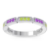 This Peridot wedding ring is casted in 14k White Gold and set with fine quality Peridot and Amethyst. All of the gemstones we use are of the top 10% available, those found in fine quality boutiques across the world. This Peridot wedding band can also be added to your collection of minimalist Peridot rings. This Band Features Sets Of Three Rounds Brilliant Gems Set in A Half Eternity Ring with Milgrain Accents Around The Shank. Free shipping, returns, resizing, and a lifetime warranty ensure you love your purchase.