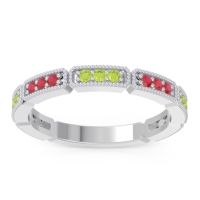 This Peridot wedding ring is casted in 14k White Gold and set with fine quality Peridot and Ruby. All of the gemstones we use are of the top 10% available, those found in fine quality boutiques across the world. This Peridot wedding band can also be added to your collection of minimalist Peridot rings. This Band Features Sets Of Three Rounds Brilliant Gems Set in A Half Eternity Ring with Milgrain Accents Around The Shank. Free shipping, returns, resizing, and a lifetime warranty ensure you love your purchase.