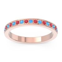 This Ruby wedding ring is casted in 18K Rose Gold and set with fine quality Ruby and Swiss Blue Topaz. All of the gemstones we use are of the top 10% available, those found in fine quality boutiques across the world. This Ruby wedding band can also be added to your collection of minimalist Ruby rings. This Ring Features Round Brilliant Gems Prong Set Between Two Secure Walls Half Way Around The Shank. Free shipping, returns, resizing, and a lifetime warranty ensure you love your purchase.