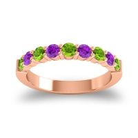 This Amethyst wedding ring is casted in 18K Rose Gold and set with fine quality Amethyst and Peridot. All of the gemstones we use are of the top 10% available, those found in fine quality boutiques across the world. This Amethyst wedding band can also be added to your collection of minimalist Amethyst rings. This Stunning Band Is Timeless Piece Essential in Any Collection. Your 9 Round Colored Stones Sit in A Shared 4 Prong Setting Across Half The Band in The Classical Style. Free shipping, returns, resizing, and a lifetime warranty ensure you love your purchase.