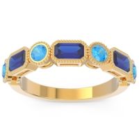 This Blue Sapphire wedding ring is casted in 14k Yellow Gold and set with fine quality Blue Sapphire and Swiss Blue Topaz. All of the gemstones we use are of the top 10% available, those found in fine quality boutiques across the world. This Blue Sapphire wedding band can also be added to your collection of minimalist Blue Sapphire rings. This Band Features Alternating Rounds Brilliants And Emerald Cuts Channel Set in A Half Eternity Ring with Milgrain Accents Around The Shank. Free shipping, returns, resizing, and a lifetime warranty ensure you love your purchase.