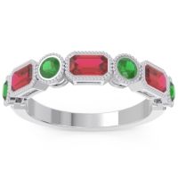 This Ruby wedding ring is casted in 14k White Gold and set with fine quality Ruby and Emerald. All of the gemstones we use are of the top 10% available, those found in fine quality boutiques across the world. This Ruby wedding band can also be added to your collection of minimalist Ruby rings. This Band Features Alternating Rounds Brilliants And Emerald Cuts Channel Set in A Half Eternity Ring with Milgrain Accents Around The Shank. Free shipping, returns, resizing, and a lifetime warranty ensure you love your purchase.