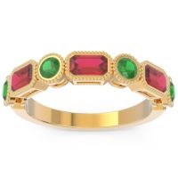 This Ruby wedding ring is casted in 18k Yellow Gold and set with fine quality Ruby and Emerald. All of the gemstones we use are of the top 10% available, those found in fine quality boutiques across the world. This Ruby wedding band can also be added to your collection of minimalist Ruby rings. This Band Features Alternating Rounds Brilliants And Emerald Cuts Channel Set in A Half Eternity Ring with Milgrain Accents Around The Shank. Free shipping, returns, resizing, and a lifetime warranty ensure you love your purchase.