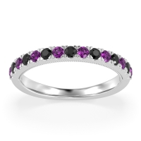 This Amethyst wedding ring is casted in Palladium and set with fine quality Amethyst and Black Onyx. All of the gemstones we use are of the top 10% available, those found in fine quality boutiques across the world. This Amethyst wedding band can also be added to your collection of minimalist Amethyst rings. This Half Eternity Band Features Pave-set Gems with Delicate Milgrain Detail Under The Stones. Free shipping, returns, resizing, and a lifetime warranty ensure you love your purchase.