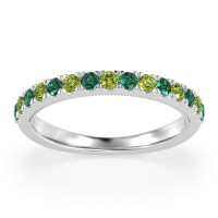 This Emerald wedding ring is casted in 18k White Gold and set with fine quality Emerald and Peridot. All of the gemstones we use are of the top 10% available, those found in fine quality boutiques across the world. This Emerald wedding band can also be added to your collection of minimalist Emerald rings. This Half Eternity Band Features Pave-set Gems with Delicate Milgrain Detail Under The Stones. Free shipping, returns, resizing, and a lifetime warranty ensure you love your purchase.