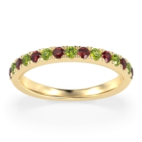 This Ruby wedding ring is casted in 14k Yellow Gold and set with fine quality Ruby and Peridot. All of the gemstones we use are of the top 10% available, those found in fine quality boutiques across the world. This Ruby wedding band can also be added to your collection of minimalist Ruby rings. This Half Eternity Band Features Pave-set Gems with Delicate Milgrain Detail Under The Stones. Free shipping, returns, resizing, and a lifetime warranty ensure you love your purchase.