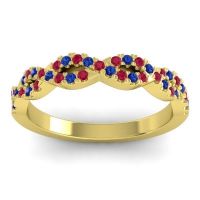 This Ruby wedding ring is casted in 18k Yellow Gold and set with fine quality Ruby and Blue Sapphire. All of the gemstones we use are of the top 10% available, those found in fine quality boutiques across the world. This Ruby wedding band can also be added to your collection of minimalist Ruby rings. This Band Adds Life To Gem And Metal with Its Organic Design. Your Round Colored Stones Sit in A 4 Prong Scalloped Pave Setting in Two intertwined Strings Across Half The Band. Free shipping, returns, resizing, and a lifetime warranty ensure you love your purchase.
