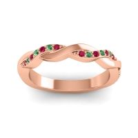 This Ruby wedding ring is casted in 18K Rose Gold and set with fine quality Ruby and Emerald. All of the gemstones we use are of the top 10% available, those found in fine quality boutiques across the world. This Ruby wedding band can also be added to your collection of minimalist Ruby rings. This Stylish Band Is The Perfect Combination Of Metal And Gem. Your Round Colored Stones Sit in A Shared 4 Prong Setting As They Twister Over And Under The Complimenting Band Of Precious Metal. Free shipping, returns, resizing, and a lifetime warranty ensure you love your purchase.