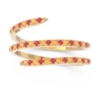 This Ruby and Citrine ring is the perfect addition to you wardrobe. Not only do we use the top 10% of gemstones available, we also make everything right here in New York City. Our Fashion Rings can be added to your collection of dainty rings, or even to your collection of stacking rings. This Ring Features Small Round Brilliants in A Shared Scalloped Prong Setting Half Way Around The Top Of A Modern Wrap Setting. Ditch the worry, embrace the shine with free shipping, returns, resizing and a lifetime warranty.