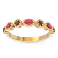 This Ruby wedding ring is casted in 14k Yellow Gold and set with fine quality Ruby and Garnet. All of the gemstones we use are of the top 10% available, those found in fine quality boutiques across the world. This Ruby wedding band can also be added to your collection of minimalist Ruby rings. This Band Features Alternating Rounds Brilliants And Marquise Cuts in A Vintage Style Half Eternity Ring with Milgrain Accents Around The Shank. Free shipping, returns, resizing, and a lifetime warranty ensure you love your purchase.
