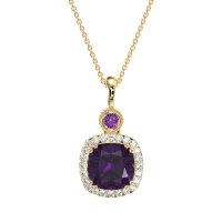 This Amethyst and Lab Diamond Necklace is casted in 14k Yellow Gold. This Women’s Halo necklace features exceptionally fine gemstones, on par with those found in the world's most exclusive boutiques and among the top 10% available globally. This Halo Pendant Features A Prominent Cushion-cut Stone, Framed By A Halo Of Smaller Gems. A Bezel-set Stone Adds A Touch Of Modern Elegance, Finished with Delicate Milgrain Detailing. This necklace comes with a complimentary 18-inch chain. Enjoy the confidence of our 30-day, stress-free return policy—with return shipping fully covered. Each piece is also accompanied by a Lifetime Warranty, ensuring lasting beauty and peace of mind.