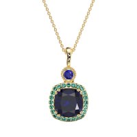 This Blue Sapphire and Emerald Necklace is casted in 14k Yellow Gold. This Women’s Halo necklace features exceptionally fine gemstones, on par with those found in the world's most exclusive boutiques and among the top 10% available globally. This Halo Pendant Features A Prominent Cushion-cut Stone, Framed By A Halo Of Smaller Gems. A Bezel-set Stone Adds A Touch Of Modern Elegance, Finished with Delicate Milgrain Detailing. This necklace comes with a complimentary 18-inch chain. Enjoy the confidence of our 30-day, stress-free return policy—with return shipping fully covered. Each piece is also accompanied by a Lifetime Warranty, ensuring lasting beauty and peace of mind.