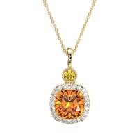This Citrine and Lab Diamond Necklace is casted in 14k Yellow Gold. This Women’s Halo necklace features exceptionally fine gemstones, on par with those found in the world's most exclusive boutiques and among the top 10% available globally. This Halo Pendant Features A Prominent Cushion-cut Stone, Framed By A Halo Of Smaller Gems. A Bezel-set Stone Adds A Touch Of Modern Elegance, Finished with Delicate Milgrain Detailing. This necklace comes with a complimentary 18-inch chain. Enjoy the confidence of our 30-day, stress-free return policy—with return shipping fully covered. Each piece is also accompanied by a Lifetime Warranty, ensuring lasting beauty and peace of mind.
