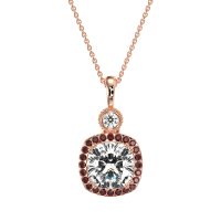 This Lab Diamond and Ruby Necklace is casted in 14K Rose Gold. This Women’s Halo necklace features exceptionally fine gemstones, on par with those found in the world's most exclusive boutiques and among the top 10% available globally. This Halo Pendant Features A Prominent Cushion-cut Stone, Framed By A Halo Of Smaller Gems. A Bezel-set Stone Adds A Touch Of Modern Elegance, Finished with Delicate Milgrain Detailing. This necklace comes with a complimentary 18-inch chain. Enjoy the confidence of our 30-day, stress-free return policy—with return shipping fully covered. Each piece is also accompanied by a Lifetime Warranty, ensuring lasting beauty and peace of mind.