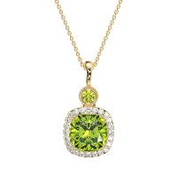 This Peridot and Diamond Necklace is casted in 14k Yellow Gold. This Women’s Halo necklace features exceptionally fine gemstones, on par with those found in the world's most exclusive boutiques and among the top 10% available globally. This Halo Pendant Features A Prominent Cushion-cut Stone, Framed By A Halo Of Smaller Gems. A Bezel-set Stone Adds A Touch Of Modern Elegance, Finished with Delicate Milgrain Detailing. This necklace comes with a complimentary 18-inch chain. Enjoy the confidence of our 30-day, stress-free return policy—with return shipping fully covered. Each piece is also accompanied by a Lifetime Warranty, ensuring lasting beauty and peace of mind.