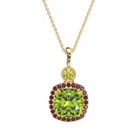 This Peridot and Ruby Necklace is casted in 14k Yellow Gold. This Women’s Halo necklace features exceptionally fine gemstones, on par with those found in the world's most exclusive boutiques and among the top 10% available globally. This Halo Pendant Features A Prominent Cushion-cut Stone, Framed By A Halo Of Smaller Gems. A Bezel-set Stone Adds A Touch Of Modern Elegance, Finished with Delicate Milgrain Detailing. This necklace comes with a complimentary 18-inch chain. Enjoy the confidence of our 30-day, stress-free return policy—with return shipping fully covered. Each piece is also accompanied by a Lifetime Warranty, ensuring lasting beauty and peace of mind.