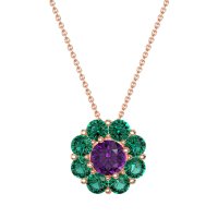 This Amethyst and Emerald Necklace is casted in 14K Rose Gold. This Women’s Halo necklace features exceptionally fine gemstones, on par with those found in the world's most exclusive boutiques and among the top 10% available globally. Radiant Floral Pendant with A Central Round Stone Encircled By Smaller Round Stones. A Captivating Design That Evokes Blossoming Beauty. This necklace comes with a complimentary 18-inch chain. Enjoy the confidence of our 30-day, stress-free return policy—with return shipping fully covered. Each piece is also accompanied by a Lifetime Warranty, ensuring lasting beauty and peace of mind.