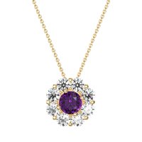 This Amethyst and Lab Diamond Necklace is casted in 14k Yellow Gold. This Women’s Halo necklace features exceptionally fine gemstones, on par with those found in the world's most exclusive boutiques and among the top 10% available globally. Radiant Floral Pendant with A Central Round Stone Encircled By Smaller Round Stones. A Captivating Design That Evokes Blossoming Beauty. This necklace comes with a complimentary 18-inch chain. Enjoy the confidence of our 30-day, stress-free return policy—with return shipping fully covered. Each piece is also accompanied by a Lifetime Warranty, ensuring lasting beauty and peace of mind.