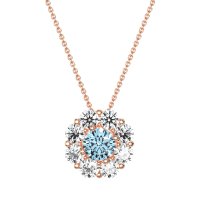 This Aquamarine and Lab Diamond Necklace is casted in 14K Rose Gold. This Women’s Halo necklace features exceptionally fine gemstones, on par with those found in the world's most exclusive boutiques and among the top 10% available globally. Radiant Floral Pendant with A Central Round Stone Encircled By Smaller Round Stones. A Captivating Design That Evokes Blossoming Beauty. This necklace comes with a complimentary 18-inch chain. Enjoy the confidence of our 30-day, stress-free return policy—with return shipping fully covered. Each piece is also accompanied by a Lifetime Warranty, ensuring lasting beauty and peace of mind.