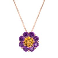 This Citrine and Amethyst Necklace is casted in 14K Rose Gold. This Women’s Halo necklace features exceptionally fine gemstones, on par with those found in the world's most exclusive boutiques and among the top 10% available globally. Radiant Floral Pendant with A Central Round Stone Encircled By Smaller Round Stones. A Captivating Design That Evokes Blossoming Beauty. This necklace comes with a complimentary 18-inch chain. Enjoy the confidence of our 30-day, stress-free return policy—with return shipping fully covered. Each piece is also accompanied by a Lifetime Warranty, ensuring lasting beauty and peace of mind.