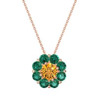 This Citrine and Emerald Necklace is casted in 14K Rose Gold. This Women’s Halo necklace features exceptionally fine gemstones, on par with those found in the world's most exclusive boutiques and among the top 10% available globally. Radiant Floral Pendant with A Central Round Stone Encircled By Smaller Round Stones. A Captivating Design That Evokes Blossoming Beauty. This necklace comes with a complimentary 18-inch chain. Enjoy the confidence of our 30-day, stress-free return policy—with return shipping fully covered. Each piece is also accompanied by a Lifetime Warranty, ensuring lasting beauty and peace of mind.