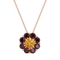 This Citrine and Ruby Necklace is casted in 14K Rose Gold. This Women’s Halo necklace features exceptionally fine gemstones, on par with those found in the world's most exclusive boutiques and among the top 10% available globally. Radiant Floral Pendant with A Central Round Stone Encircled By Smaller Round Stones. A Captivating Design That Evokes Blossoming Beauty. This necklace comes with a complimentary 18-inch chain. Enjoy the confidence of our 30-day, stress-free return policy—with return shipping fully covered. Each piece is also accompanied by a Lifetime Warranty, ensuring lasting beauty and peace of mind.