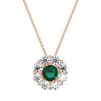 This Emerald and Lab Diamond Necklace is casted in 14K Rose Gold. This Women’s Halo necklace features exceptionally fine gemstones, on par with those found in the world's most exclusive boutiques and among the top 10% available globally. Radiant Floral Pendant with A Central Round Stone Encircled By Smaller Round Stones. A Captivating Design That Evokes Blossoming Beauty. This necklace comes with a complimentary 18-inch chain. Enjoy the confidence of our 30-day, stress-free return policy—with return shipping fully covered. Each piece is also accompanied by a Lifetime Warranty, ensuring lasting beauty and peace of mind.