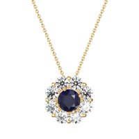 This Lab Blue Sapphire and Lab Diamond Necklace is casted in 18k Yellow Gold. This Women’s Halo necklace features exceptionally fine gemstones, on par with those found in the world's most exclusive boutiques and among the top 10% available globally. Radiant Floral Pendant with A Central Round Stone Encircled By Smaller Round Stones. A Captivating Design That Evokes Blossoming Beauty. This necklace comes with a complimentary 18-inch chain. Enjoy the confidence of our 30-day, stress-free return policy—with return shipping fully covered. Each piece is also accompanied by a Lifetime Warranty, ensuring lasting beauty and peace of mind.