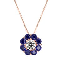 This Lab Diamond and Blue Sapphire Necklace is casted in 14K Rose Gold. This Women’s Halo necklace features exceptionally fine gemstones, on par with those found in the world's most exclusive boutiques and among the top 10% available globally. Radiant Floral Pendant with A Central Round Stone Encircled By Smaller Round Stones. A Captivating Design That Evokes Blossoming Beauty. This necklace comes with a complimentary 18-inch chain. Enjoy the confidence of our 30-day, stress-free return policy—with return shipping fully covered. Each piece is also accompanied by a Lifetime Warranty, ensuring lasting beauty and peace of mind.