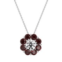 This Lab Diamond and Ruby Necklace is casted in Palladium. This Women’s Halo necklace features exceptionally fine gemstones, on par with those found in the world's most exclusive boutiques and among the top 10% available globally. Radiant Floral Pendant with A Central Round Stone Encircled By Smaller Round Stones. A Captivating Design That Evokes Blossoming Beauty. This necklace comes with a complimentary 18-inch chain. Enjoy the confidence of our 30-day, stress-free return policy—with return shipping fully covered. Each piece is also accompanied by a Lifetime Warranty, ensuring lasting beauty and peace of mind.