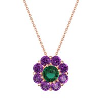 This Lab Emerald and Amethyst Necklace is casted in 14K Rose Gold. This Women’s Halo necklace features exceptionally fine gemstones, on par with those found in the world's most exclusive boutiques and among the top 10% available globally. Radiant Floral Pendant with A Central Round Stone Encircled By Smaller Round Stones. A Captivating Design That Evokes Blossoming Beauty. This necklace comes with a complimentary 18-inch chain. Enjoy the confidence of our 30-day, stress-free return policy—with return shipping fully covered. Each piece is also accompanied by a Lifetime Warranty, ensuring lasting beauty and peace of mind.