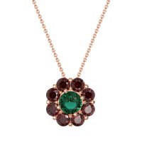 This Lab Emerald and Garnet Necklace is casted in 14K Rose Gold. This Women’s Halo necklace features exceptionally fine gemstones, on par with those found in the world's most exclusive boutiques and among the top 10% available globally. Radiant Floral Pendant with A Central Round Stone Encircled By Smaller Round Stones. A Captivating Design That Evokes Blossoming Beauty. This necklace comes with a complimentary 18-inch chain. Enjoy the confidence of our 30-day, stress-free return policy—with return shipping fully covered. Each piece is also accompanied by a Lifetime Warranty, ensuring lasting beauty and peace of mind.