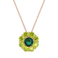 This Lab Emerald and Peridot Necklace is casted in 14K Rose Gold. This Women’s Halo necklace features exceptionally fine gemstones, on par with those found in the world's most exclusive boutiques and among the top 10% available globally. Radiant Floral Pendant with A Central Round Stone Encircled By Smaller Round Stones. A Captivating Design That Evokes Blossoming Beauty. This necklace comes with a complimentary 18-inch chain. Enjoy the confidence of our 30-day, stress-free return policy—with return shipping fully covered. Each piece is also accompanied by a Lifetime Warranty, ensuring lasting beauty and peace of mind.