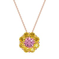 This Pink Tourmaline and Citrine Necklace is casted in 14K Rose Gold. This Women’s Halo necklace features exceptionally fine gemstones, on par with those found in the world's most exclusive boutiques and among the top 10% available globally. Radiant Floral Pendant with A Central Round Stone Encircled By Smaller Round Stones. A Captivating Design That Evokes Blossoming Beauty. This necklace comes with a complimentary 18-inch chain. Enjoy the confidence of our 30-day, stress-free return policy—with return shipping fully covered. Each piece is also accompanied by a Lifetime Warranty, ensuring lasting beauty and peace of mind.