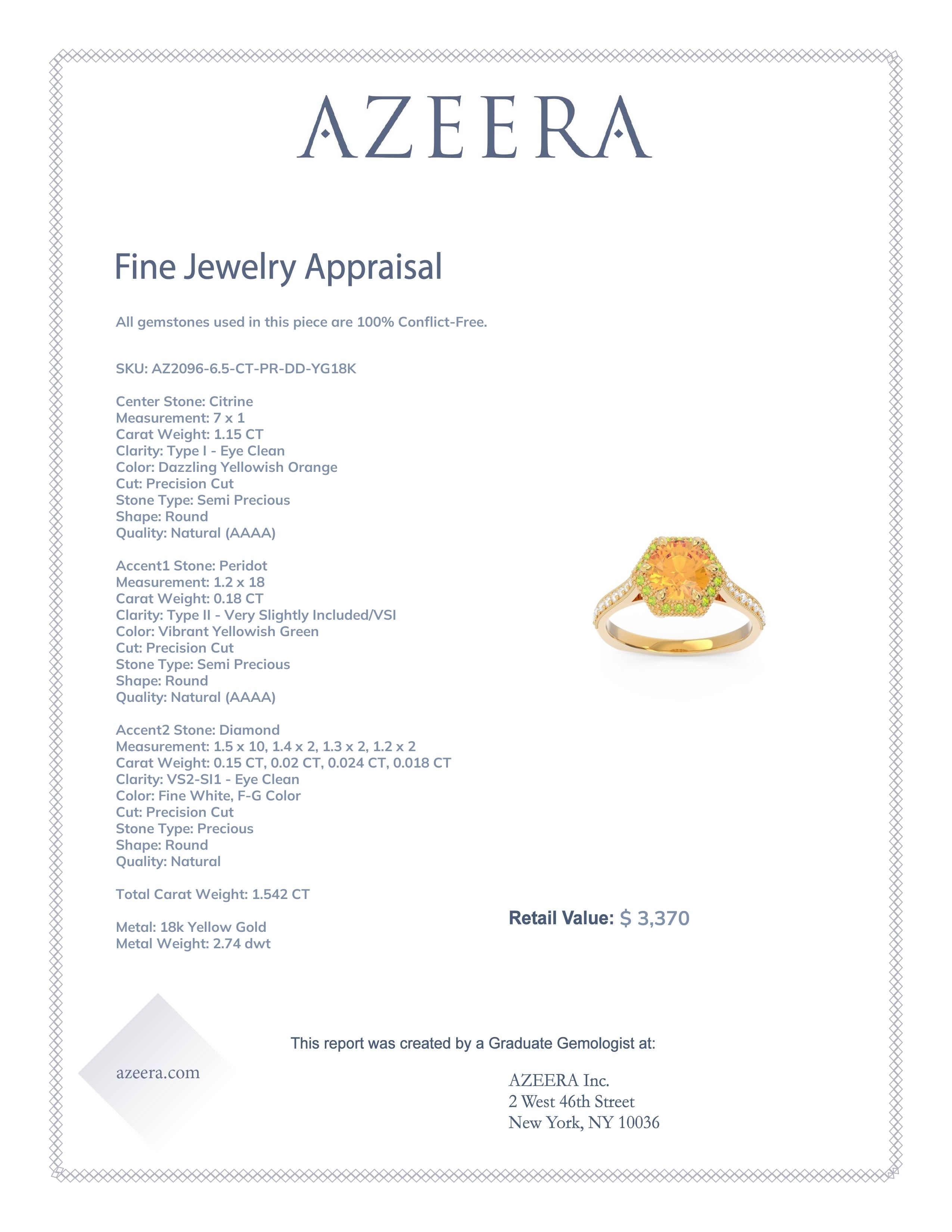 This 18k Yellow Gold Citrine ring features a Round Citrine, along with Peridot and Diamond. This Citrine engagement ring can even be added to your collection of gemstone rings. Make this stunning Citrine engagement ring your own. This Ring Features A Large Round Brilliant in A 6 Claw Prong Raised Cathedral Setting Accented with A Hexagon Halo, Smaller Rounds Around The Shank, And Milgrain Detail. This product comes with Free Shipping, Free Returns, Free Resize and a lifetime warranty. Choose your favorite metal and gem combination and experience the joy of customization.