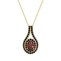 This Garnet and Black Onyx Necklace is casted in 14k Yellow Gold. This Women’s Halo necklace features exceptionally fine gemstones, on par with those found in the world's most exclusive boutiques and among the top 10% available globally. This Beautiful Pendant Features A Central Oval Stone Wrapped By A Double Halo Of Smaller Stones, Creating A Captivating And Radiant Design. This necklace comes with a complimentary 18-inch chain. Enjoy the confidence of our 30-day, stress-free return policy—with return shipping fully covered. Each piece is also accompanied by a Lifetime Warranty, ensuring lasting beauty and peace of mind.