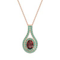 This Ruby and Emerald Necklace is casted in 18K Rose Gold. This Women’s Halo necklace features exceptionally fine gemstones, on par with those found in the world's most exclusive boutiques and among the top 10% available globally. This Beautiful Pendant Features A Central Oval Stone Wrapped By A Double Halo Of Smaller Stones, Creating A Captivating And Radiant Design. This necklace comes with a complimentary 18-inch chain. Enjoy the confidence of our 30-day, stress-free return policy—with return shipping fully covered. Each piece is also accompanied by a Lifetime Warranty, ensuring lasting beauty and peace of mind.