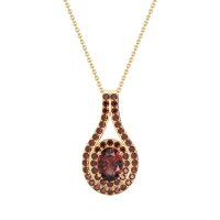 This Ruby and Garnet Necklace is casted in 14k Yellow Gold. This Women’s Halo necklace features exceptionally fine gemstones, on par with those found in the world's most exclusive boutiques and among the top 10% available globally. This Beautiful Pendant Features A Central Oval Stone Wrapped By A Double Halo Of Smaller Stones, Creating A Captivating And Radiant Design. This necklace comes with a complimentary 18-inch chain. Enjoy the confidence of our 30-day, stress-free return policy—with return shipping fully covered. Each piece is also accompanied by a Lifetime Warranty, ensuring lasting beauty and peace of mind.