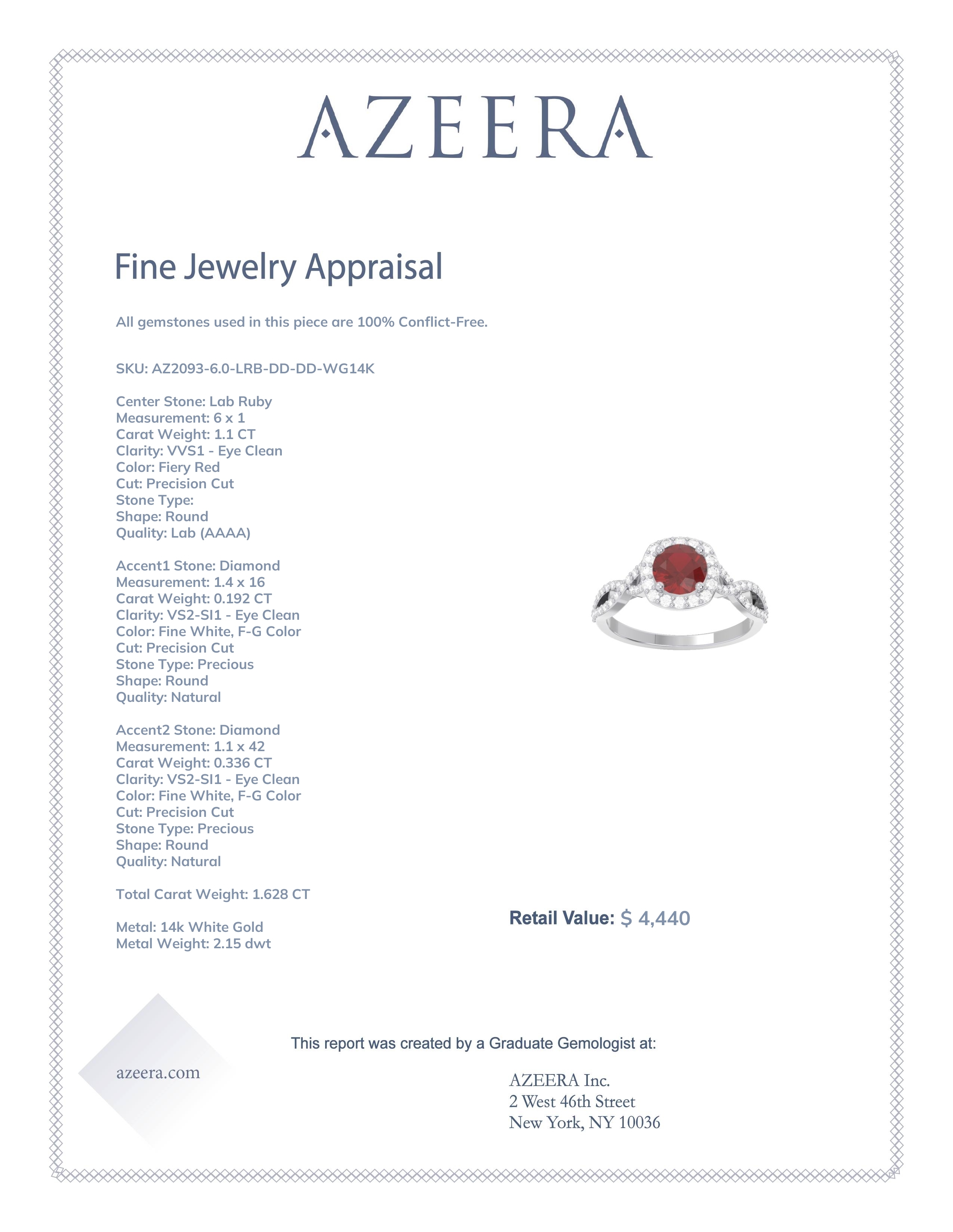 This 14k White Gold Lab Ruby ring features a Round Lab Ruby, along with fine quality Diamond. This Ring Features A Large Round Brilliant in A Raised Cathedral Setting Accented with A Cushion Shaped Halo And Smaller Rounds On A Braided Split Shank. We only use the top 10% of gems available, those found in the finest jewelry shops across the world. This Lab Ruby engagement ring can also be worn as an Lab Ruby and Diamond gemstone ring and added to your collection! Enjoy Free Shipping and Returns, Free Resize and a lifetime warranty.